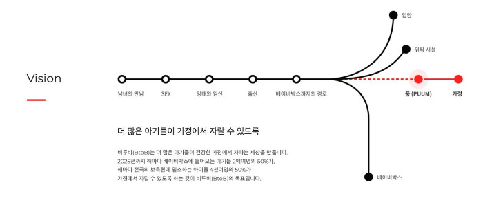 결국은 사회구조적인 문제 때문에 떨어져 살아야 하는 부모와 아기가 없어지는 세상이 되면 좋겠어요. 그걸 위해 비투비가 열심히 일하고 있으니까요. 조직의 이름인 비투비는 아기를 키우는 모든 부모를 위한 사회자원이 흐르는 통로가 되었으면 하는 바람에서 지은 이름인데요, 이름처럼 저희가 영향력 있는 통로가 되어서 원하는 세상이 앞당겼으면 해요.
