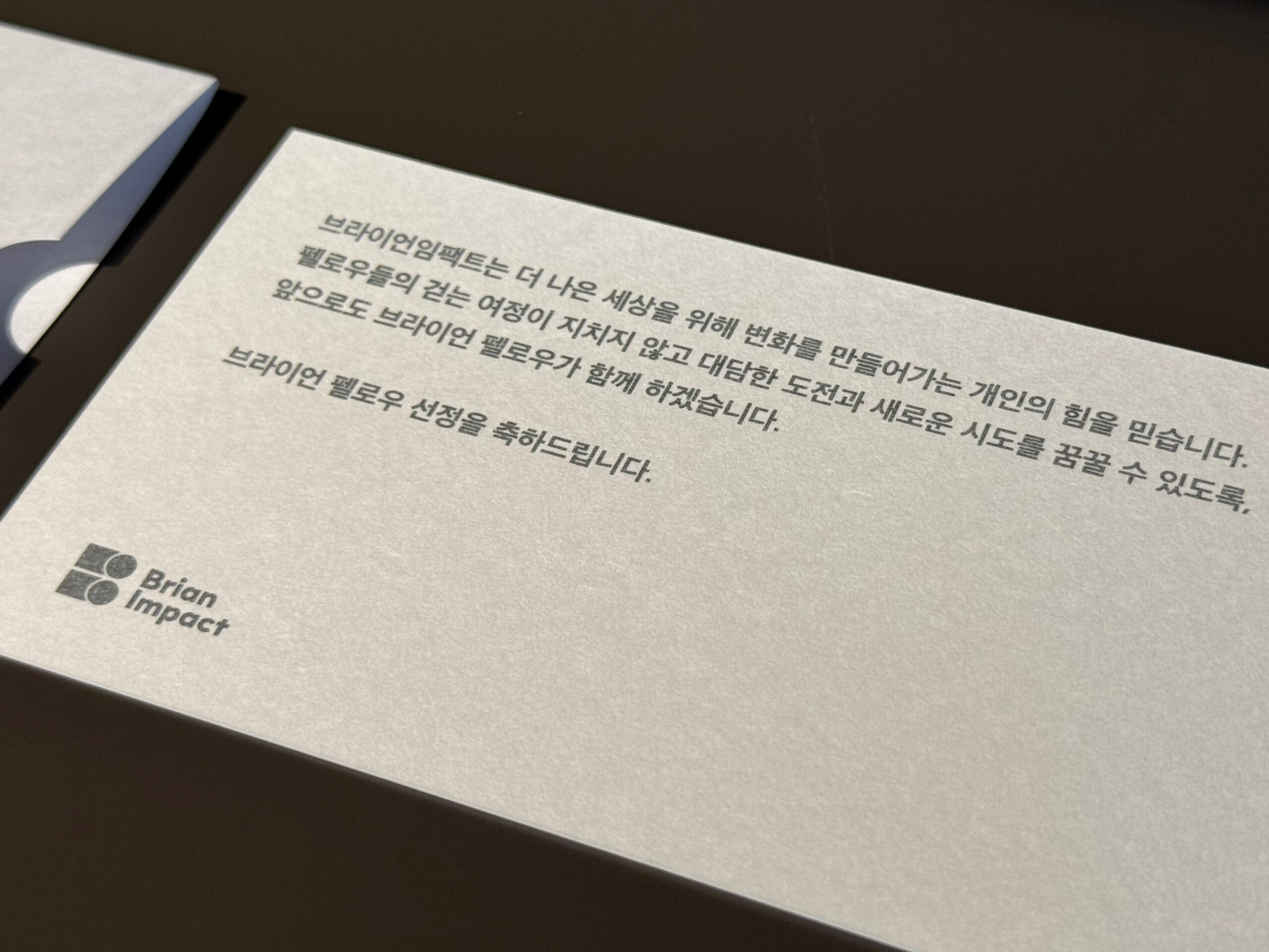 브라이언 펠로우 기념패는 펠로우들이 지금까지 달려온 여정에 대한 감사와 앞으로의 여정에 대한 응원의 마음을 담아 제작하였으며, 재단 로고의 상징 ‘B’를 형상화하여 브라이언 펠로우들에게 브라이언임팩트가 곁에서 함께 뛰는 러닝메이트가 되겠다는 뜻을 담았습니다.