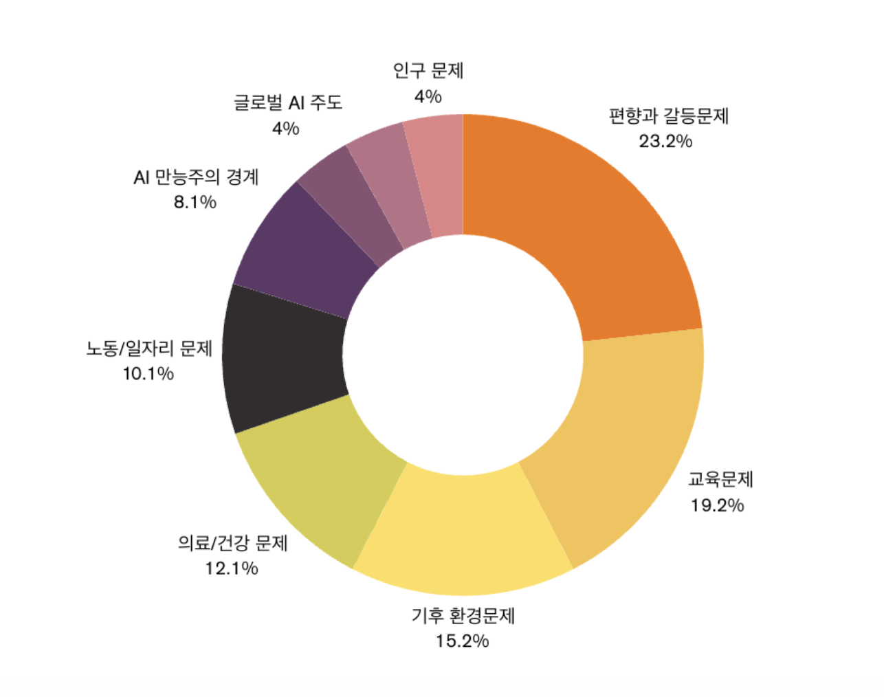 그다음으로는 교육 문제(19.2%), 기후·환경 문제(15.2%), 의료·건강 문제(12.1%), 노동·일자리 문제(10.1%) 순으로 중요하게 인식되었습니다. 교육, 환경, 의료, 일자리 문제는 글로벌적으로도 AI로 해결해야 할 큰 문제로 보편적으로 인식되는 추세이며, 많은 시도가 이뤄지고 있는 분야입니다.