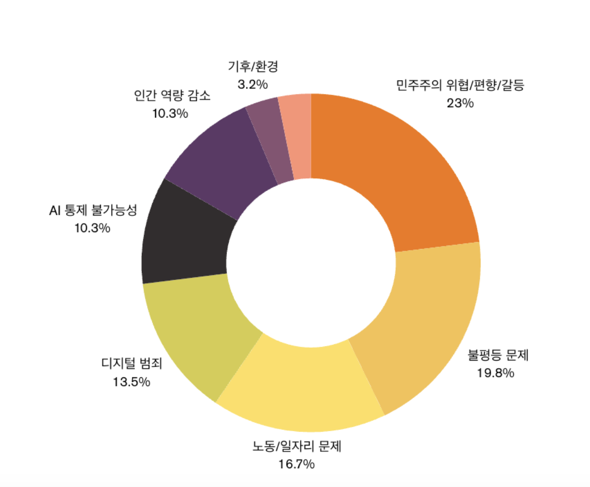 그다음으로는 불평등 문제(19.8%), 노동·일자리 변화(16.7%), 디지털 범죄(13.5%), AI의 통제 불가능성(10.3%) 등이 우려 요인으로 꼽혔습니다. AI가 새로운 기회를 창출하는 동시에, 사회적 문제를 더욱 복잡하게 만들 수 있다는 점에서 신중한 접근이 필요한 시점입니다.