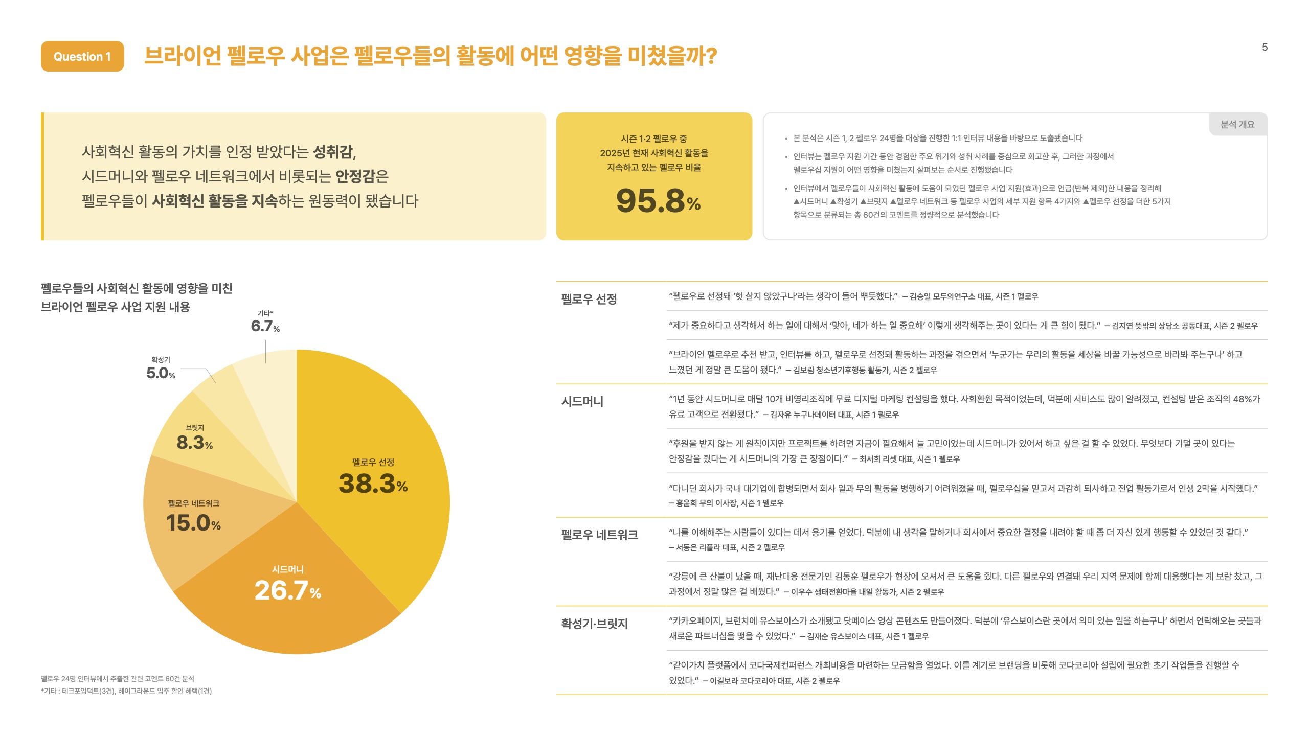무엇보다 눈에 띄는 결과는 시즌 1·2 펠로우 24명 중 95.8%가 현재도 사회혁신 활동을 지속하고 있다는 점입니다.