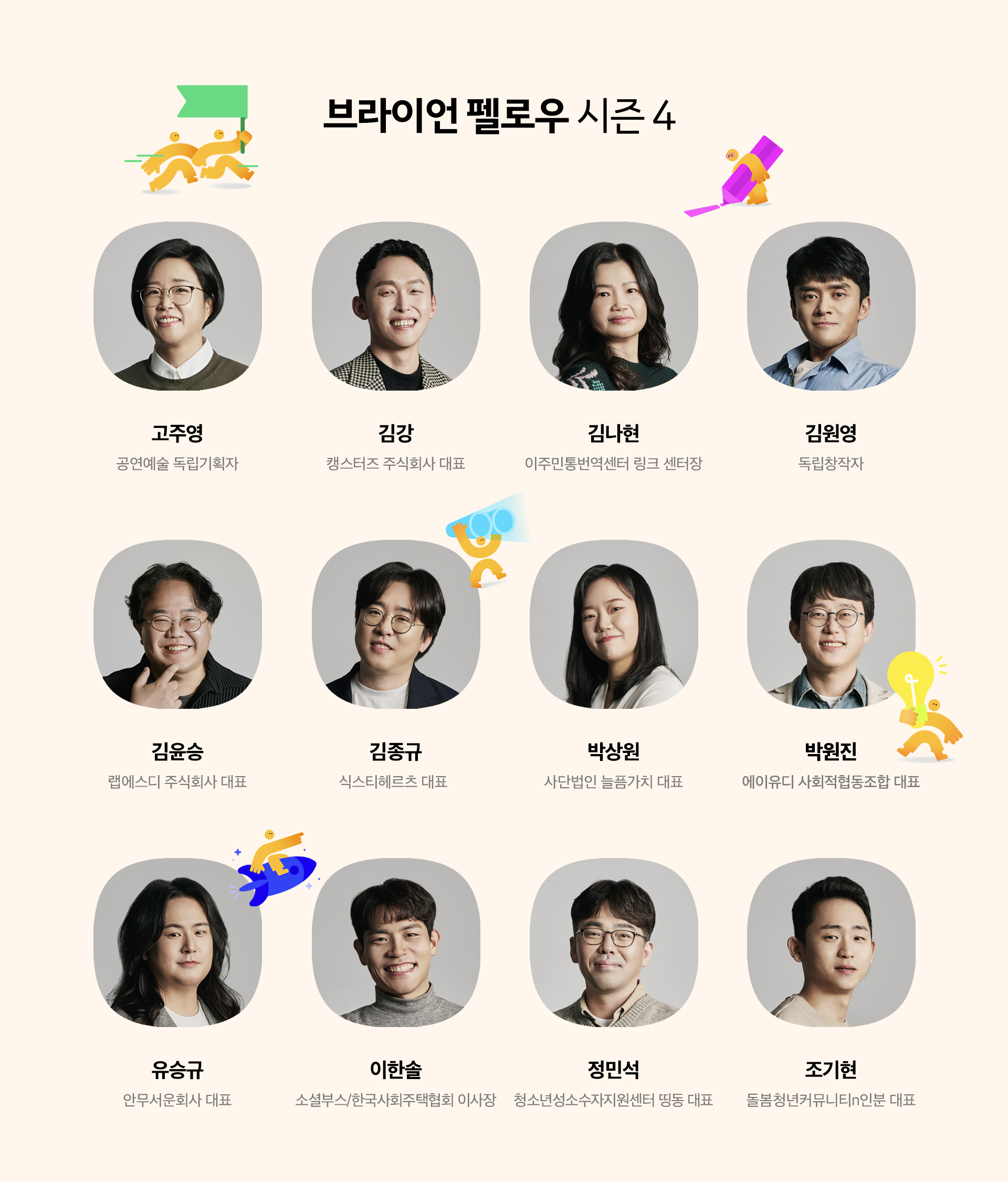 이번 시즌4에 최종 선정된 펠로우는 △고주영(공연예술 독립기획자) △김강(캥스터즈 주식회사 대표) △김나현(사단법인 이주민과 함께 부설 이주민통번역센터 링크 센터장) △김원영(독립창작자) △김윤승(랩에스디 주식회사 대표) △김종규(식스티헤르츠 대표) △박상원(사단법인 늘픔가치 대표) △박원진(에이유디 사회적협동조합 대표) △유승규(주식회사 안무서운회사 대표) △이한솔(소셜부스/한국사회주택협회 이사장) △정민석(청소년성소수자지원센터 띵동 대표) △조기현(돌봄청년 커뮤니티 n인분 대표) 등 12명이다. (이상 가나다 순)