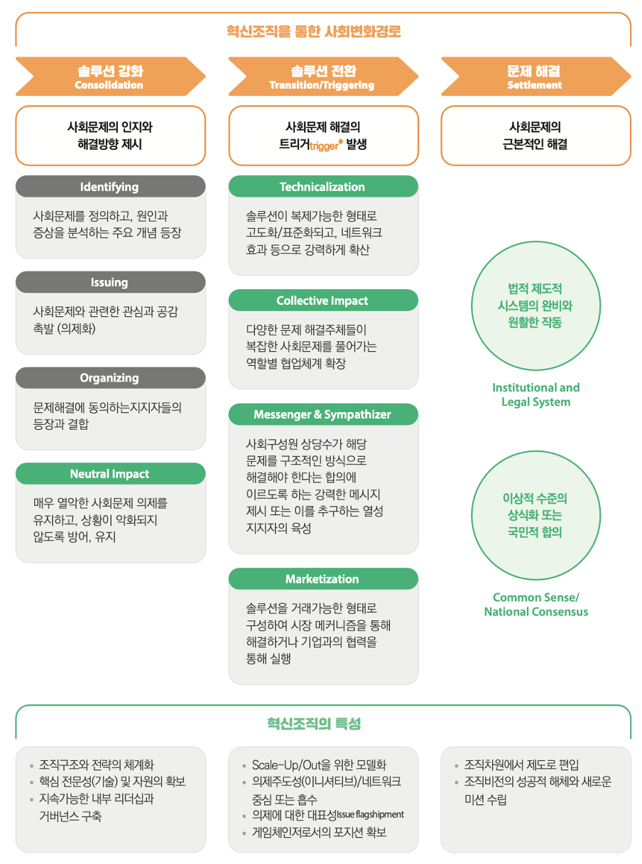 📍두 번째 단계는 사회문제를 해결할 수 있는 매우 효과적인 방법이 만들어지고, 빠른 속도로 솔루션이 확산되는 국면으로 전환(Transition)되는 단계입니다.