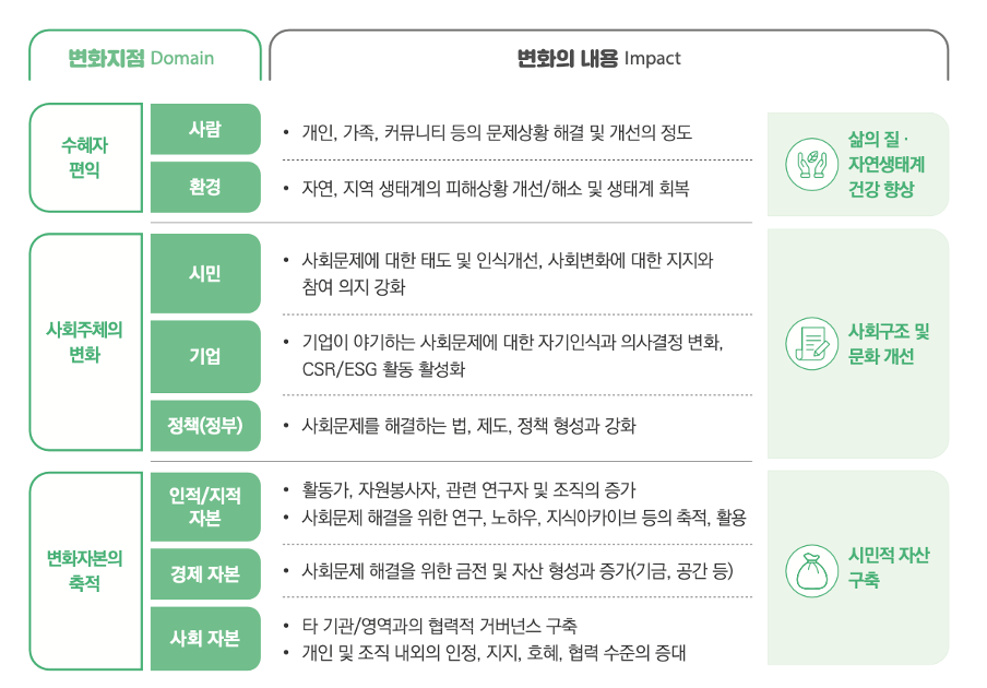 임팩트그라운드는 사회문제가 근본적으로 해결되는 것을 지향합니다. 더 나은 세상을 만들어가는 혁신조직을 통해 사회문제가 근본적으로 해결되는 과정(사회변화경로)을 아래와 같이 크게 세 단계로 나누고 있습니다.