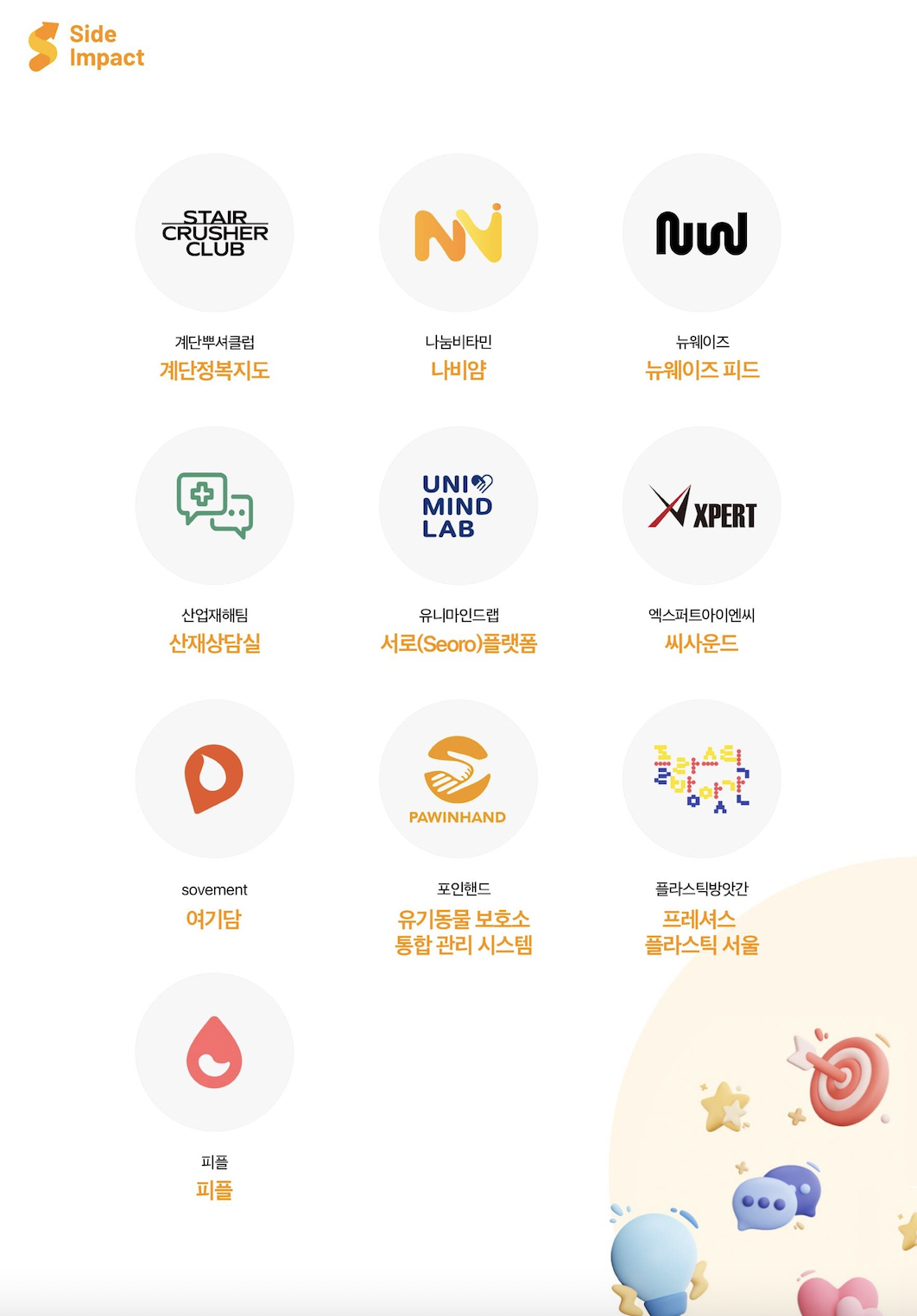 [2023년 10월 16일] 재단법인 브라이언임팩트가 기술로 세상을 바꾸는 프로젝트를 발굴해 팀별로 1200만원의 연간 운영비를 지원하는 ‘사이드임팩트’ 베타라운드의 최종 선정 프로젝트 10팀을 발표했다. 사이드임팩트 베타라운드 프로젝트 선정은 기술로 사회를 바꾸기 위하여 모인 219명의 ‘사이드임팩트 커뮤니티’ 구성원들의 리뷰와 투표를 통해 최종 선정됐다.